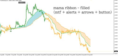 mama ribbon - filled (mtf + alerts + arrows + button) mama ribbon - filled (mtf + alerts + arrows + button)はJohn Ehlers氏によって開発されたMESA適応移動平均線をもとに作られたインジケーターです。このMESA適応移動平均線は階段状に表示されるの…