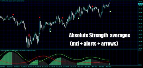 AbsoluteStrength averages (mtf + alerts + arrows) AbsoluteStrength averages (mtf + alerts + arrows)は、ラインのクロスとヒストグラムの色の変化でサインを出してくれるインジケーターです。