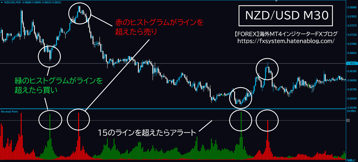Reversal Pointは、こちらで決めた数値をヒストグラムが超えたらアラートが鳴ります。こちらで決めた数値を超えたときは相場が反転する可能性があります。ちなみにリペイントしますがリペイント対策として他のサイン系のインジと組み合わせるといいかもしれません。