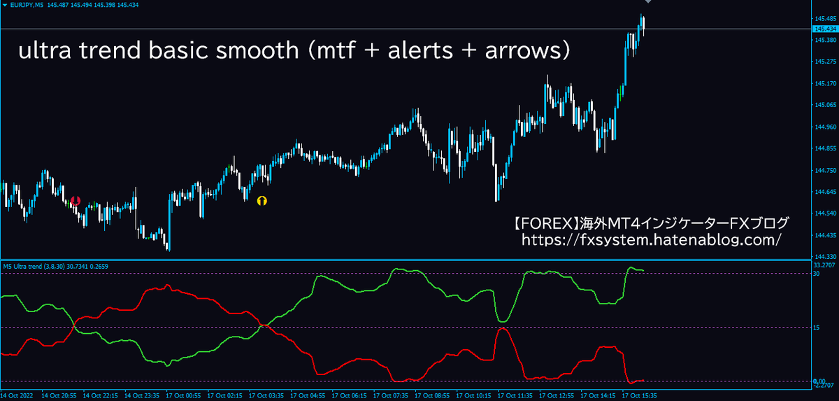 ultra trend basic smooth (mtf + alerts + arrows)は2本のラインが交差したときにアラートを鳴らしてくれます。
