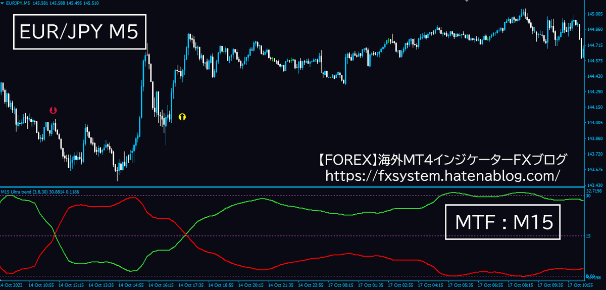 【参考チャート】ドル円5分足に15分足のMTFを入れたチャート