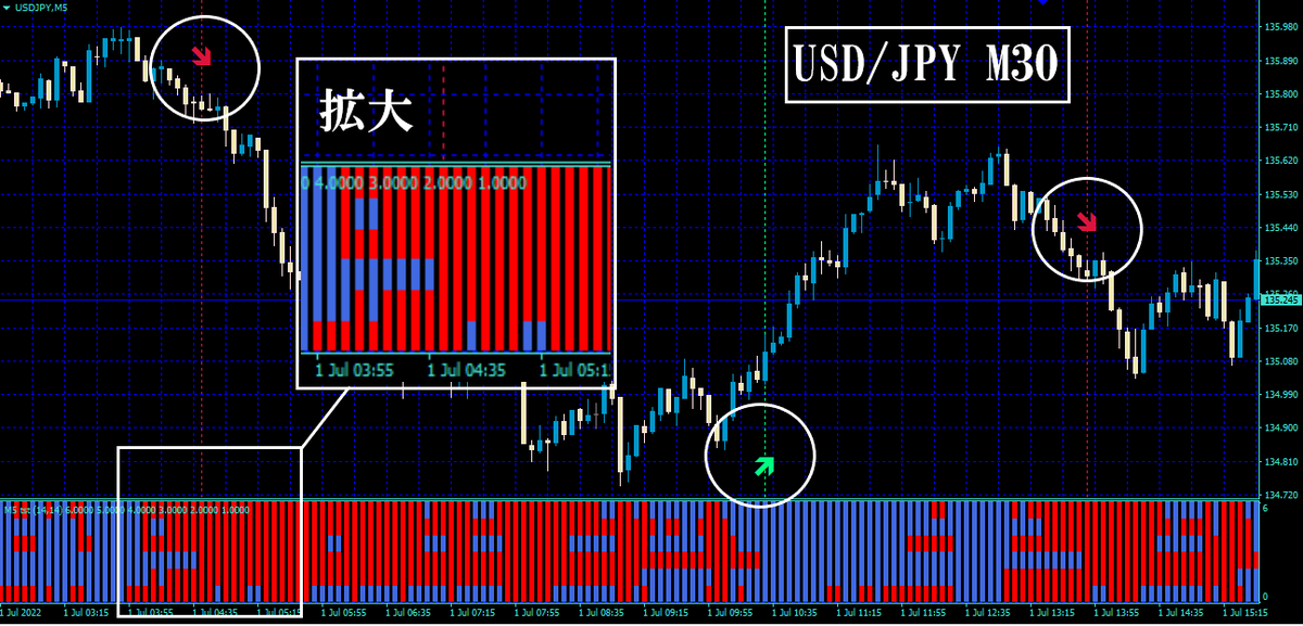 ちょっと見辛いかもしれませんが赤と青のヒストグラムがすべてそろったところでサインが出るようになっています。